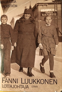![]() Lottajohtaja Fanni Luukkonen kävelyllä sotilaspojan ja pikkulotan kanssa talvisodan aikaisessa Hämeenlinnassa. Kansikuva Fanni Luukkonen - Lottajohtaja (Bäckström 1993). Otava. |
